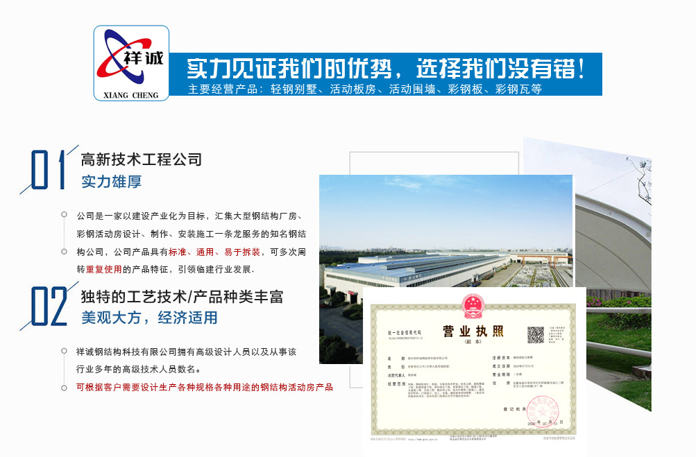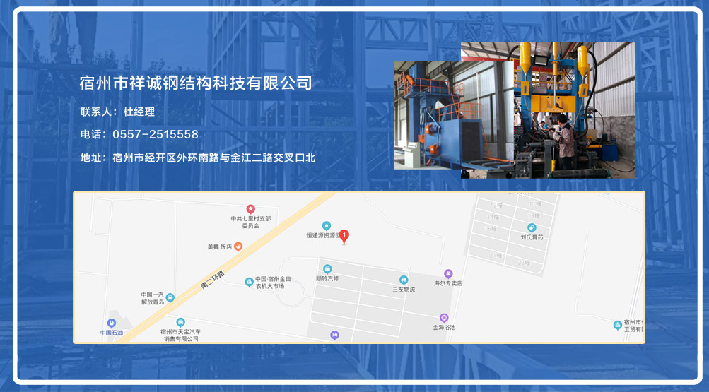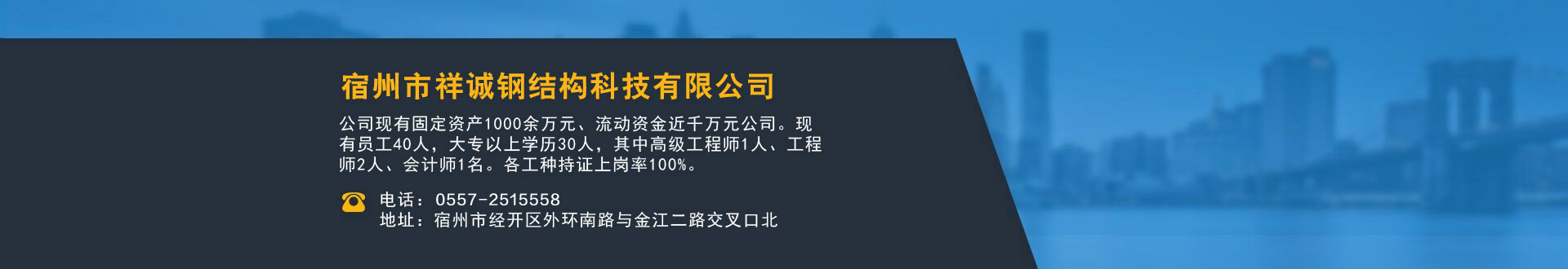宿州市祥誠鋼結(jié)構(gòu)科技有限公司位于宿州市經(jīng)開區(qū)外環(huán)南路與金江二路交叉口北,公司是一家以建設(shè)產(chǎn)業(yè)化為目標(biāo),匯集大型鋼結(jié)構(gòu)廠房、彩鋼活動(dòng)房設(shè)計(jì)、制作、安裝施工一條龍服務(wù)的知名鋼結(jié)構(gòu)公司。公司現(xiàn)有固定資產(chǎn)1000余萬元、流動(dòng)資金近千萬元公司。現(xiàn)有員工40人,大專以上學(xué)歷30人,其中高級工程師1人、工程師2人、會計(jì)師1名。各工種持證上崗率100%。高效化的年青團(tuán)隊(duì)為公司帶來了蓬勃發(fā)展的動(dòng)力,全體員工以務(wù)實(shí)的態(tài)度,拼搏的精神,創(chuàng)造著企業(yè)的每一天。 公司組織結(jié)構(gòu)嚴(yán)格按現(xiàn)代企業(yè)制度設(shè)計(jì),管理機(jī)構(gòu)設(shè)置合理,制度完善,各部門分工明確...